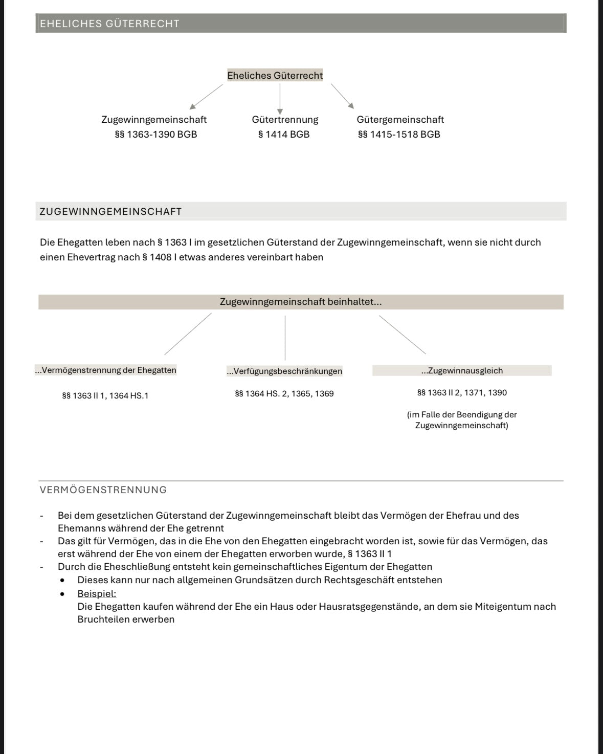 Begriff und Entstehung der Ehe, allgemeine Ehewirkungen wie eheliche Lebensgemeinschaft (§ 1353 BGB), Ehename, Schlüsselgewalt und Haftungsregelungen. Ebenso die Eheunterhaltspflichten und die gesetzliche Eigentumsvermutung (§ 1362 BGB).